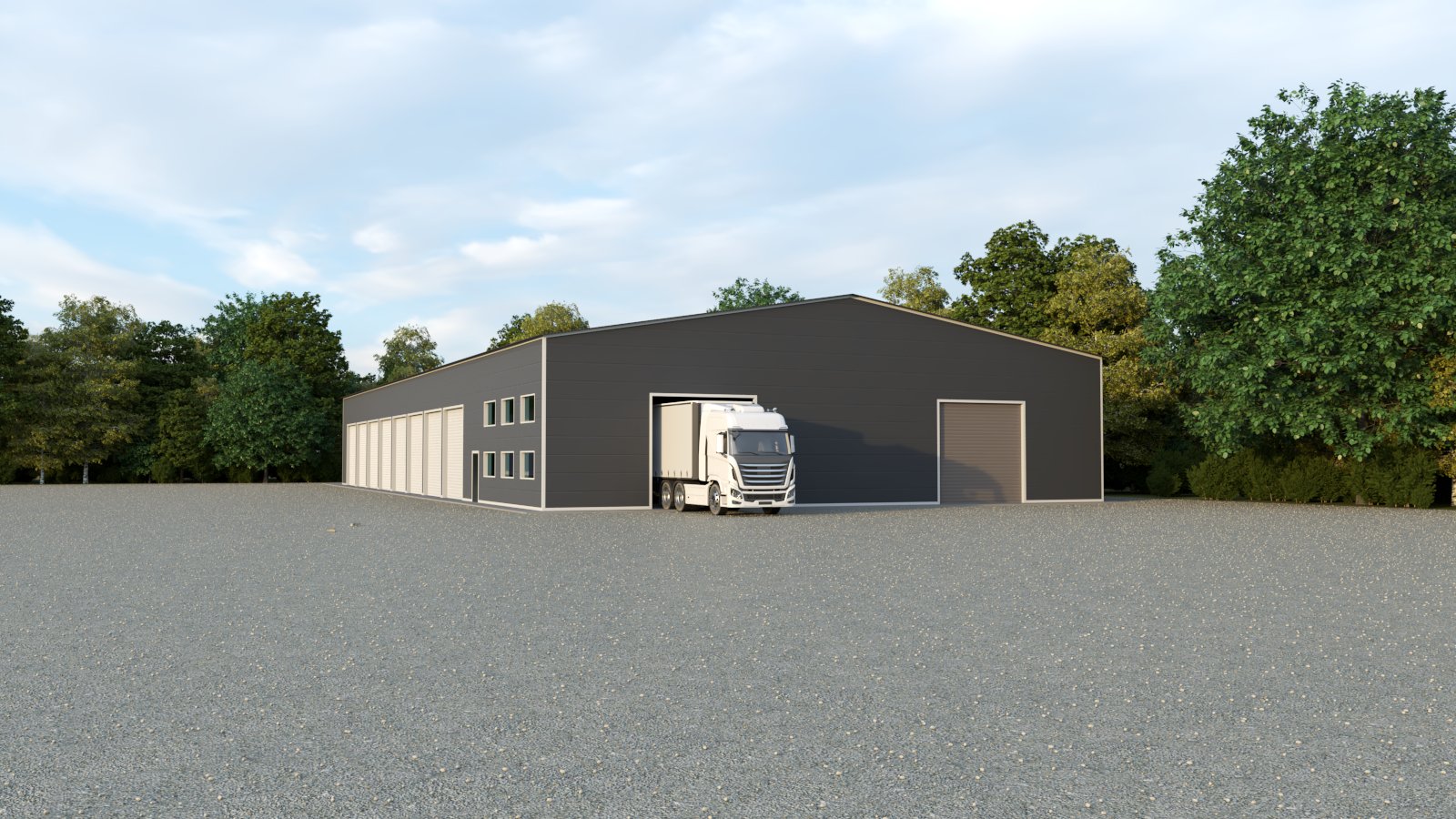 This specific hangar is insulated. You can use configurator and reconfigure it if you wish. Angular hangar has diverse customization possibilities, including length, width, height, elements as gates, doors, windows, insulation, and more.