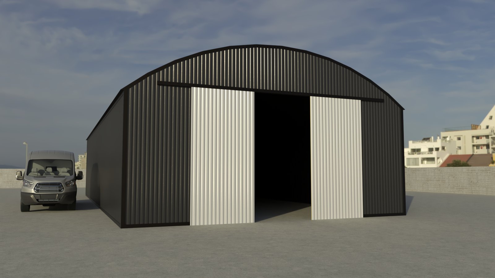 Arched hangar with straight walls in size 10x20m is good for equipment and compact machinery storing, as well as for a temporary storage of crop: grains and other goods. It is easy to install, and is fully pre-fabricated at Hangaro factory.