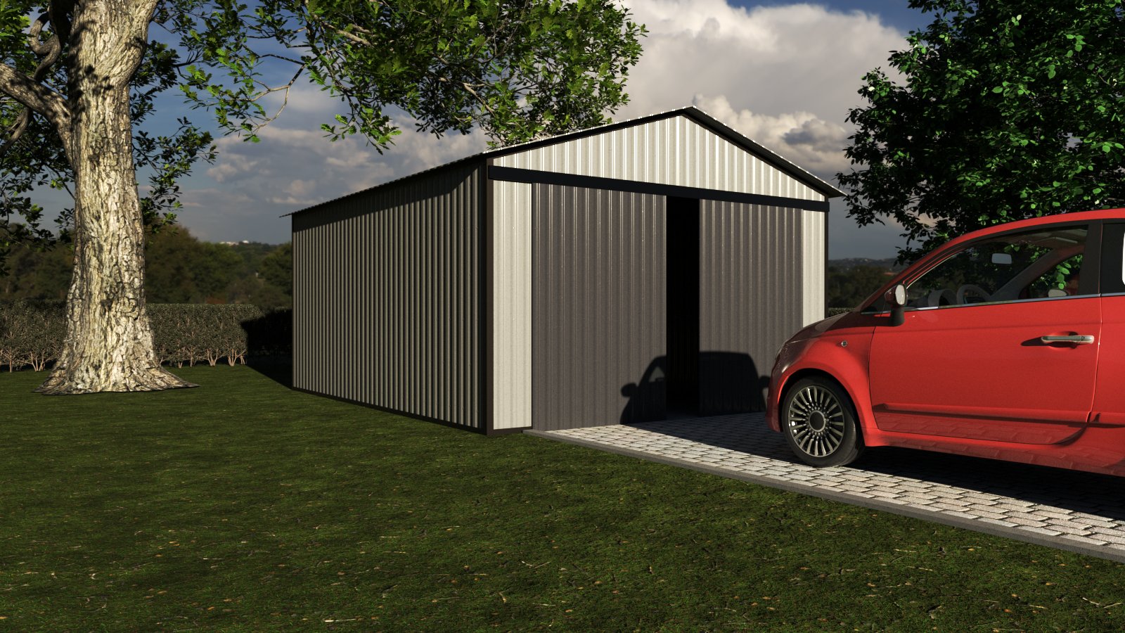 This is a 4x5m garage. The garage has various customization possibilities, including color, doors and windows, gates, and more. You can use configurator to change any properties of accessories of the garage.